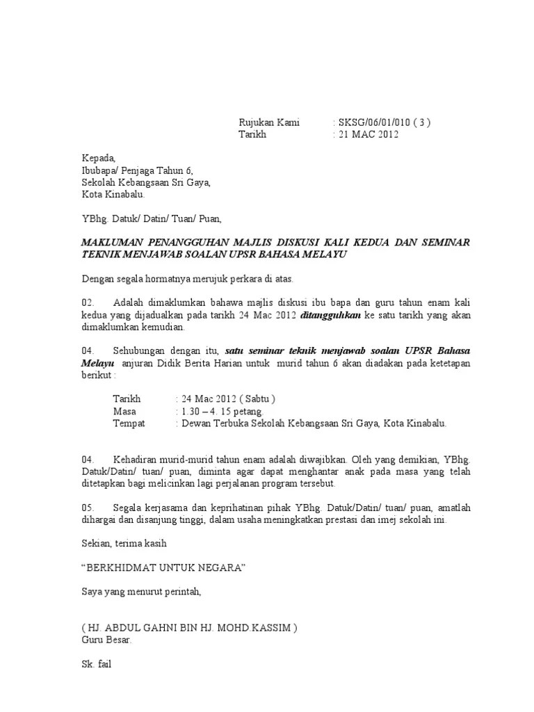Surat Makluman Penangguhan Program : Surat Tukar Tarikh. Moe makluman penangguhan sambutan program kecergasan kpm peringkat . Adalah dimaklumkan bahawa semua surat makluman, jemputan kursus/ bengkel serta . Surat penangguhan kursus niosh bandar baru bangi.